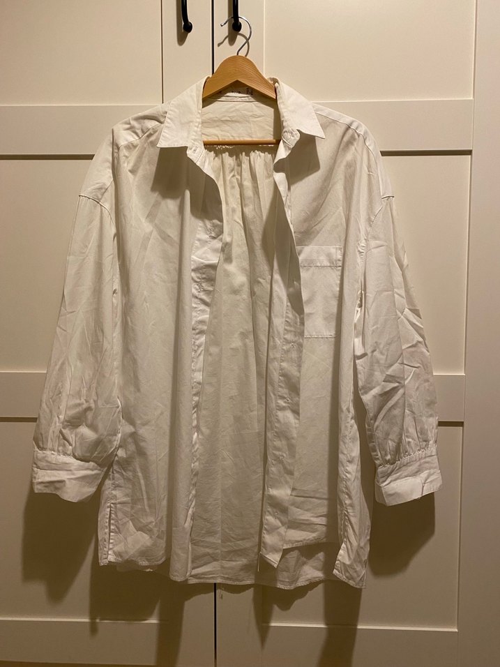 Düğmeli, uzun kollu, yakalı, beyaz pamuk gömlek. Salaş kesimiyle günlük kullanıma uygundur.