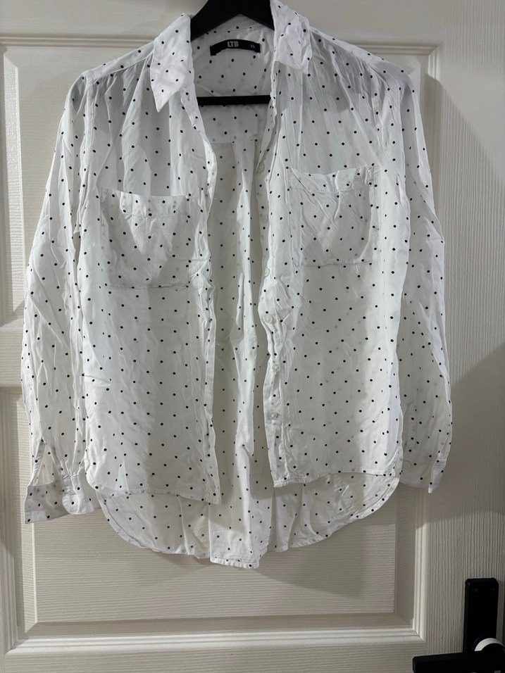 Pamuk kumaştan, düğmeli, uzun kollu, V yakalı, beyaz zemin üzerine siyah puantiyeli, rahat kesim kadın gömleği.