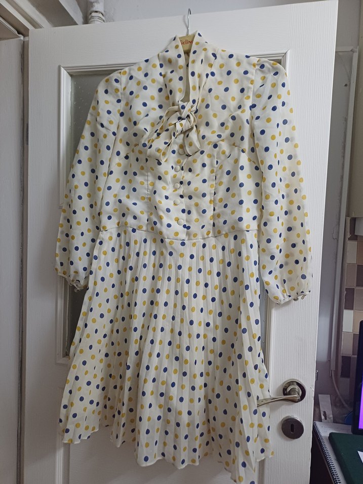 ust ve etek kisminda astar vardir kollarda yoktur boynunda flqr icin uzun ekler var birkac yerde sokuk vardir tamirat gerekir bazi yerlerinde ipkacmasi vardir resimde mevcut iki kol arasi 46 cm omuzdan boy 94 cm etekleri pileli dikisler acilmis tamirat gerekir fiyati uygun tuttum