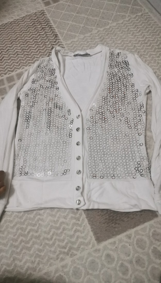 Uzun kollu, V yaka beyaz triko hırka, düğmeli ön kısmı ve nakışlı payet detaylarıyla günlük kullanıma uygun, dar kesim.