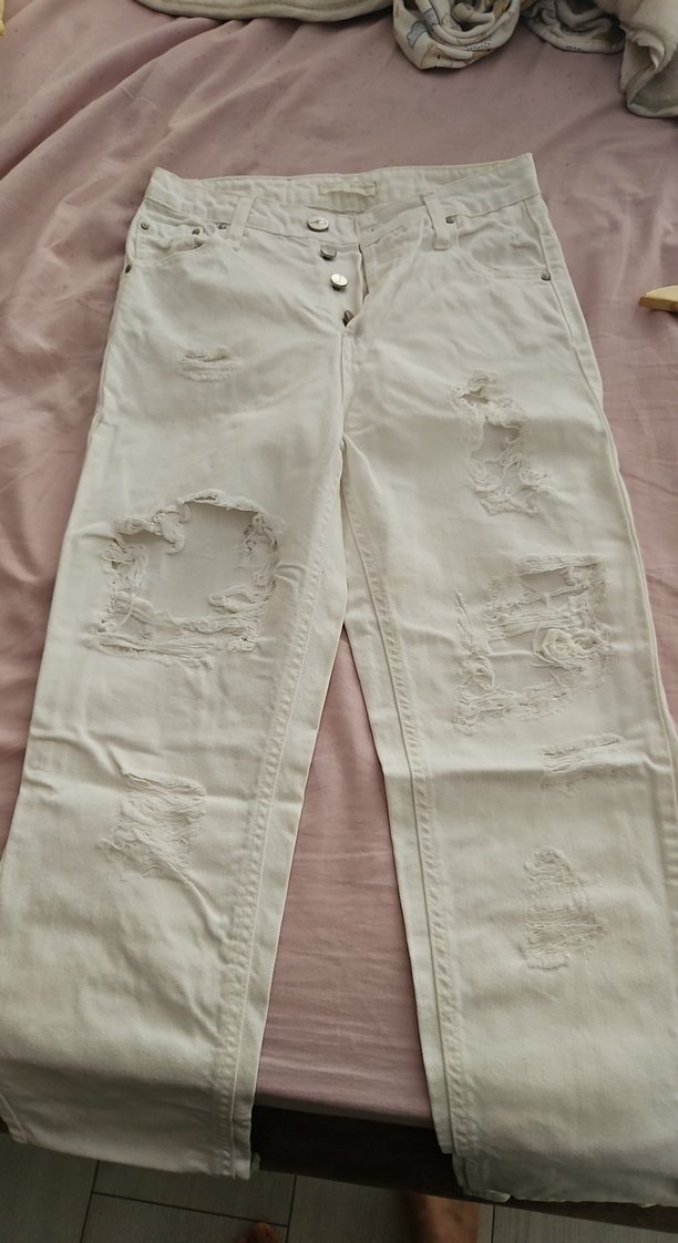 Pamuklu, düğmeli beyaz kot pantolon. Rahat kesim ve midi boy, yıpranmış detaylarla günlük sokak stili için uygundur.