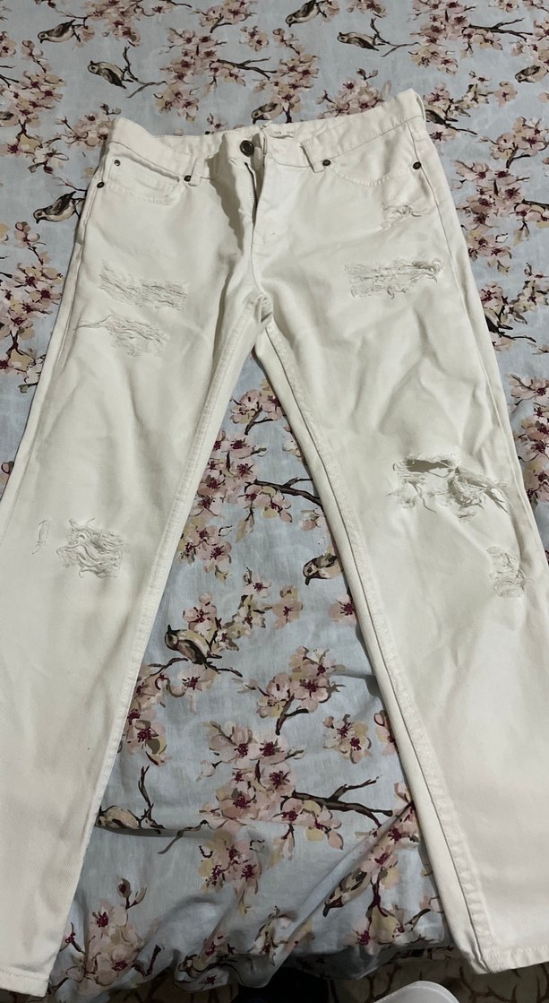 Düğmeli, rahat kesim,düşük bel beyaz kot pantolon. Yıpranmış detaylara sahip, midi boy ve günlük kullanım için uygundur.