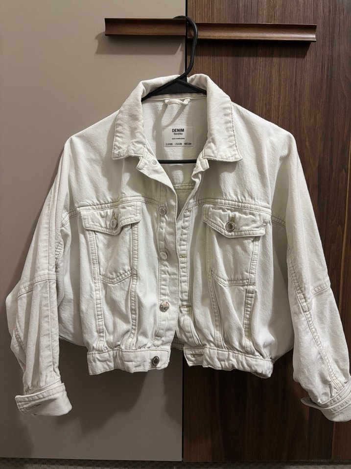 Bu beyaz kot ceket, düğmeli ön, uzun kollu ve yakası kesik detaylıdır. Salaş kesimi ve midi boyu ile günlük sokak stiline uygundur. İki göğüs cebi bulunur. Hiçbir sorunu yoktur.
