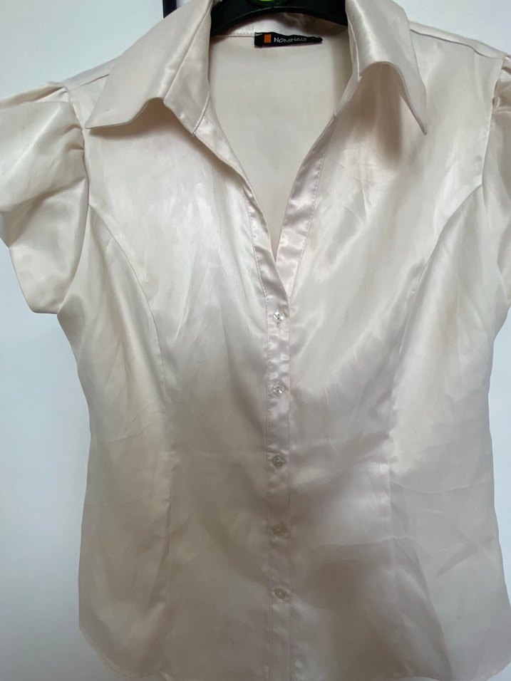 Beyaz, parlak saten kumaştan, düğmeli ve yakalı kısa kollu, normal boyda, dar kesim kadın gömlek. Ofis ve günlük kullanıma uygun. ✨