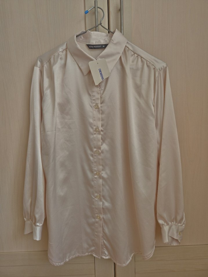 Düğmeli, yakalı, uzun kollu beyaz gömlek, saten kumaştan, rahat kesim. Ofis için uygun.