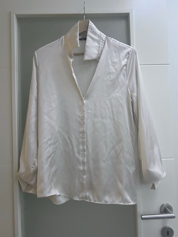 Düğmeli beyaz saten gömlek, yakalı ve uzun kollu, bol kesimlidir. Parlak ve yumuşak dokusuyla ofis için şık ve çağdaş bir Paris tarzı sunar.