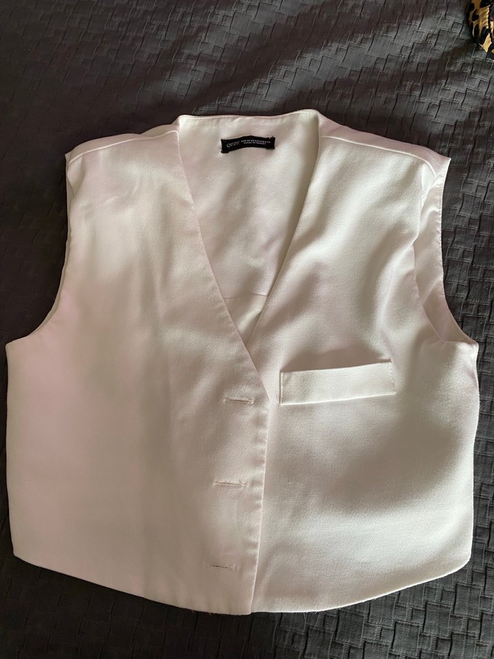 Düğmeli, saten kumaştan, yakalı ve kolsuz beyaz yelek. Normal uzunlukta, rahat kesim, ofis kullanımı için uygun. ✨