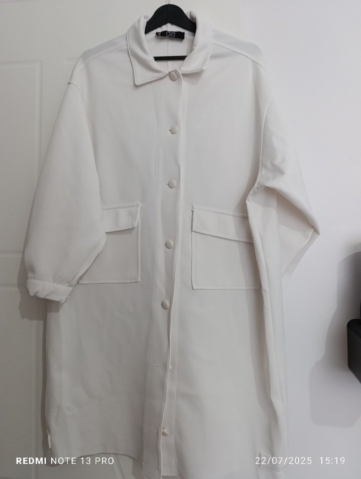 Düğmeli, çıtçıtlı beyaz kap, bol kesimdir. Yumuşak sentetik kumaştan üretilmiştir, günlük kullanıma uygundur