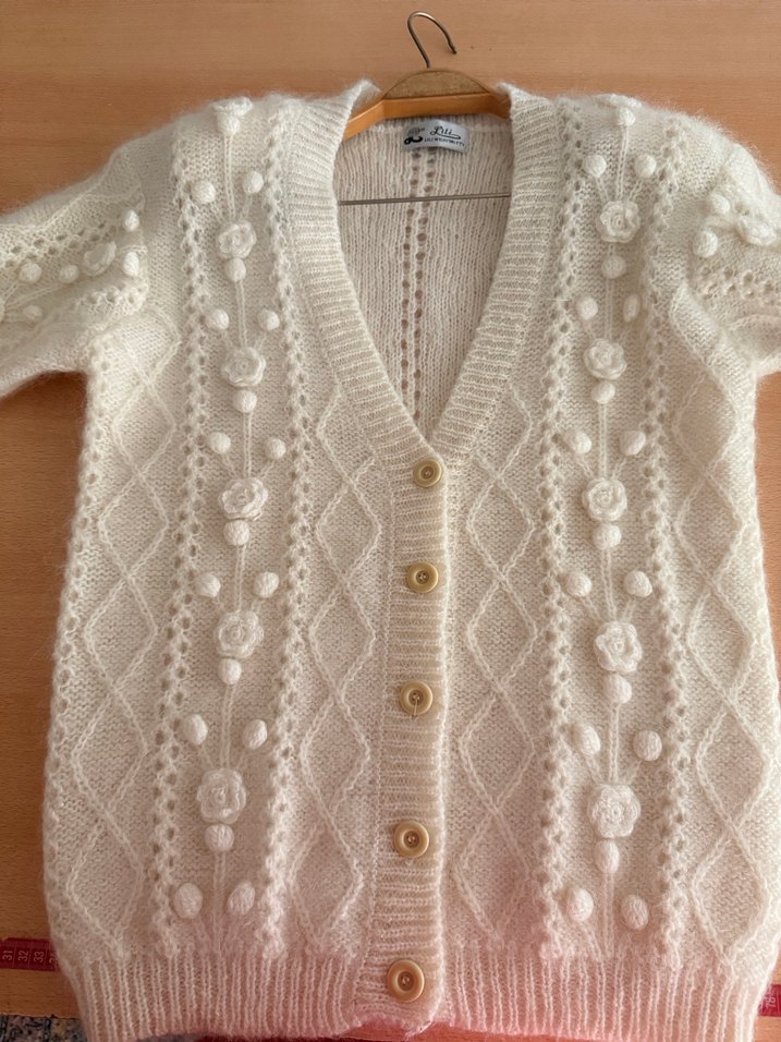 Düğmeli kırık beyaz renkte örgü hırka, bol uzun kollu. Yumuşak dokulu, sade ve bohem vintage tarzda sıfırdır hiç kullanılmadı