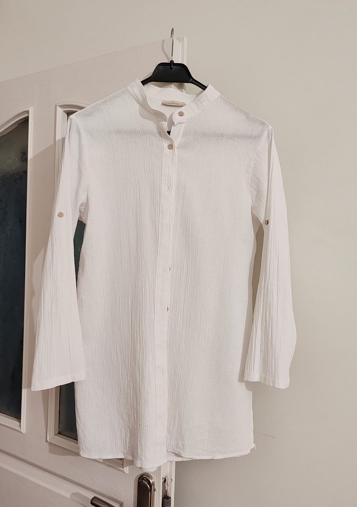 Düğmeli, uzun kollu beyaz keten gömlek, yakalı ve midi boydadır. Bol kesimi ve sade tasarımıyla günlük kullanıma uygun,kolları kıvrık kullanılabilir. Xl ama 36-38-40 bedenlere olur, ölçüler resimlerde var. Yüzde yüz pamuk, ince tiril tiril yazlık harika bir parça. Güzel günlerde kullanın. Marka temsili.