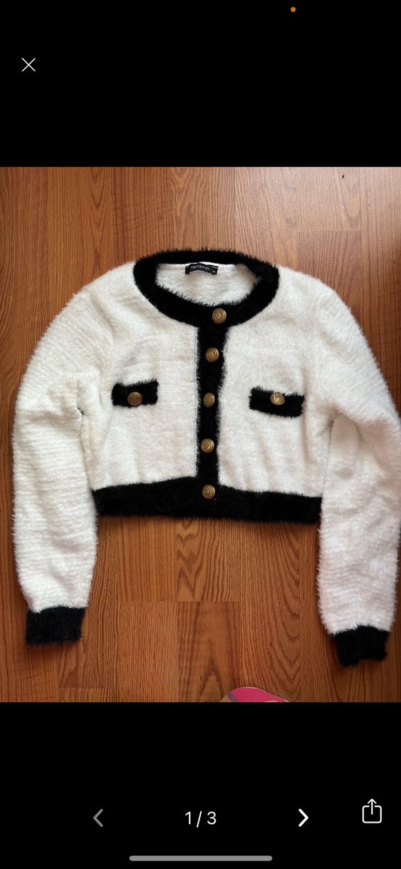 Uzun kollu, yuvarlak yakalı, düğmeli beyaz kadın hırka. Siyah kenar ve ceplerle kontrast oluşturur. Rahat ve şık, günlük kullanıma uygun.