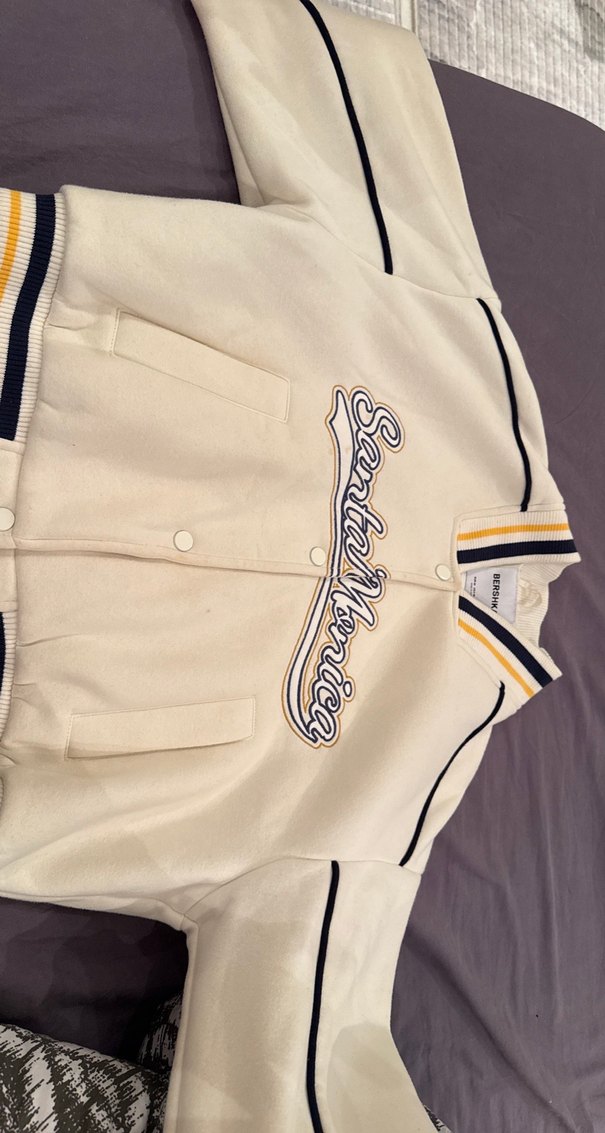 Düğmeli, kısa kollu beyaz bomber ceket, baskılı detaylar ve şeritli yakasıyla rahat ve şık bir günlük spor giyim parçasıdır.