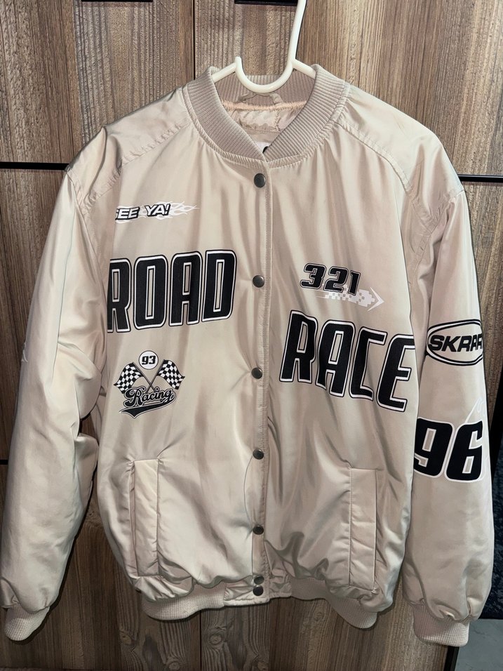 Beyaz renkli, düğmeli, uzun kollu ve baskılı desenlere sahip bol kesim street wear kadın ceket. Sentetik kumaştan, günlük kullanıma uygun.