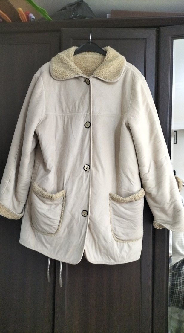 Beyaz süet kumaştan yapılmış, düğmeli ve notched lapel yakalı kadın ceket. Uzun kollu, bol kesim ve yumuşak astarlı ceplere sahip midi boyda bir dış giyim ürünü.