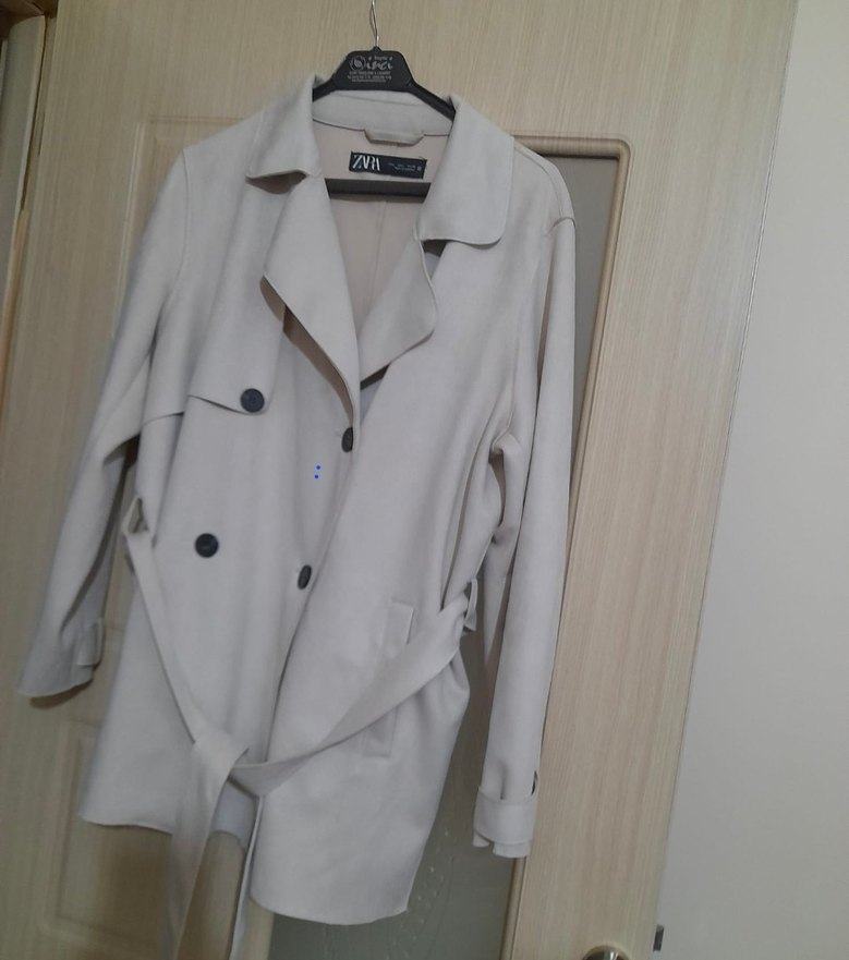Beyaz süet malzemeden yapılmış, düğmeli, yakalı ve uzun kollu midi trençkot. Rahat kalıplı, günlük sokak stili için uygun.
