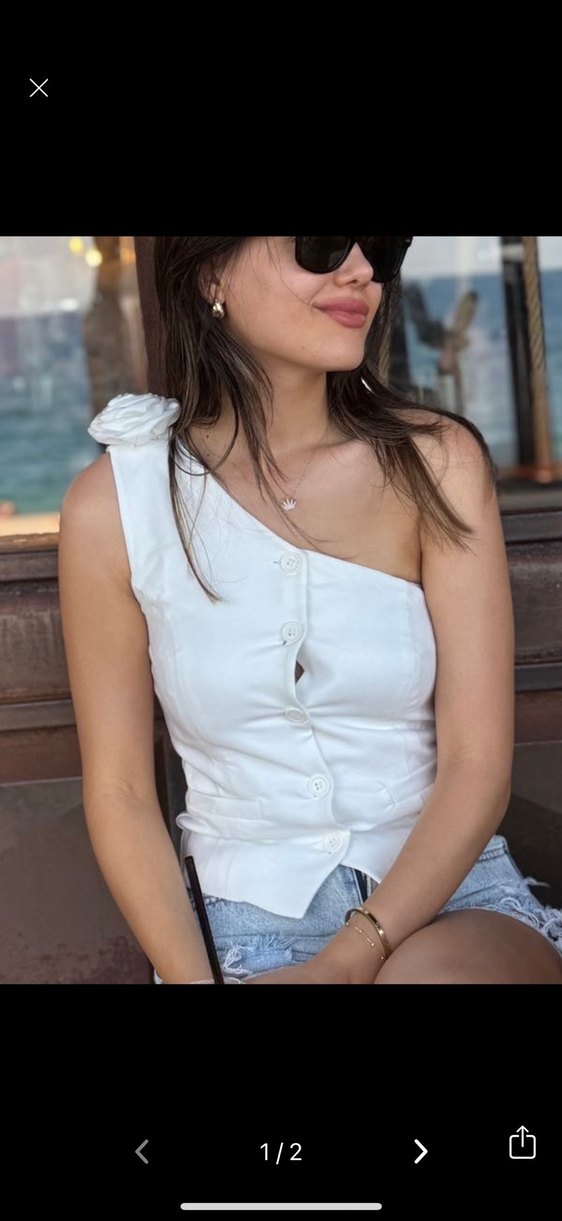Düğmeli, tek omuz askılı beyaz denim bluz, salaş sokak stili için uygun. Kolsuz ve kısa kesim, günlük rahatlık sağlar. Az kullanıldı bedenden dolayı satışta bana dar oluyor, 34 beden.