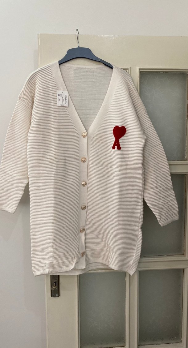 Uzun kollu, düğmeli beyaz triko hırka, yaka kısmında kesimli ve göğüste kırmızı nakış detaylı. Rahat ve bol kesim, günlük sokak stili için uygun.