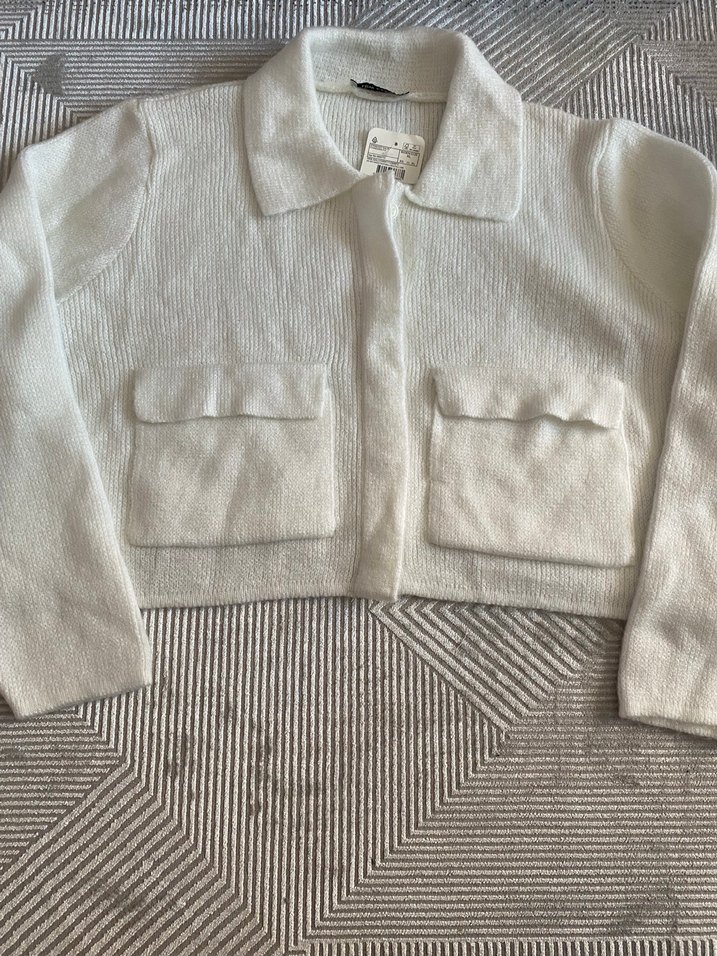 Düğmeli, beyaz triko hırka, kesik yakalı ve iki ön ceplidir. Uzun kollu, fitted kesim midi boyda, günlük kullanıma uygundur.