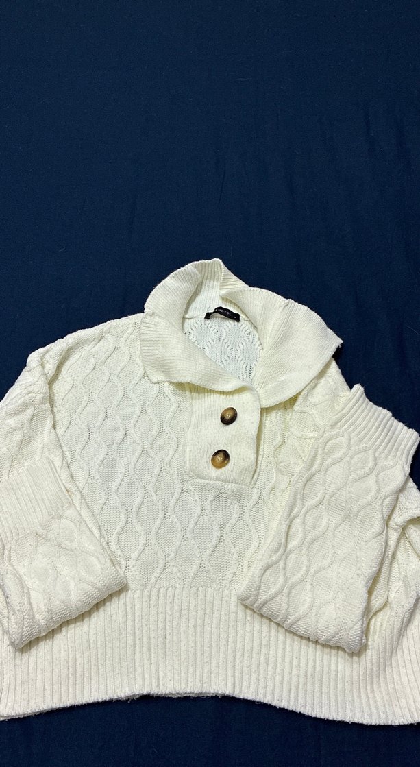 Düğmeli önü, uzun kollu ve yakalı beyaz triko kadın kazak. Rahat ve bol kesimiyle günlük sokak stiline uygundur. Yumuşak ve konforlu kumaş sunar.