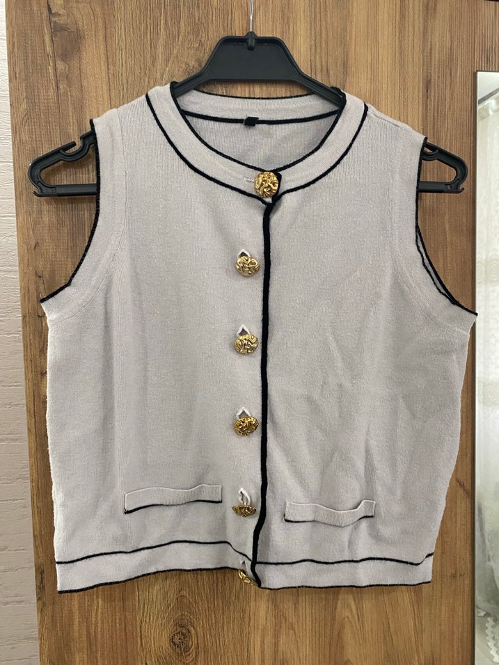 Düğmeli, kruvaze yaka beyaz triko yelek. İnce siyah şeritlerle detaylandırılmış, vücuda oturan kesime sahip, günlük ve şık bir parça.