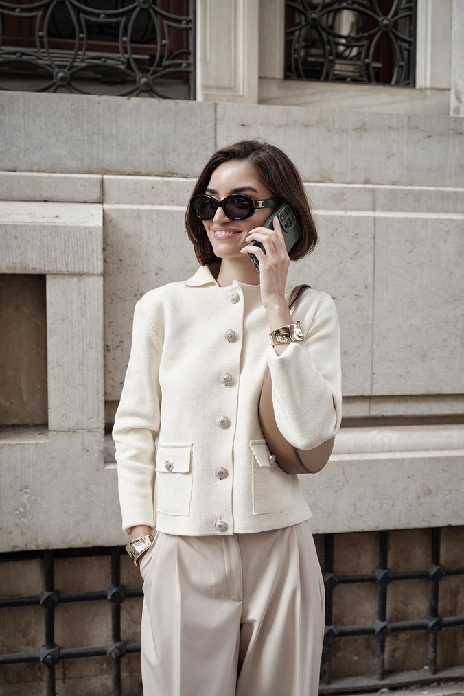 Düğmeli ön kısmı, uzun kollu ve kesik yakalı beyaz mini ofis ceketi. İpek gibi kumaştan, günlük kullanım için rahat kesim sunar. Trendy ve şık görünüm sağlar.