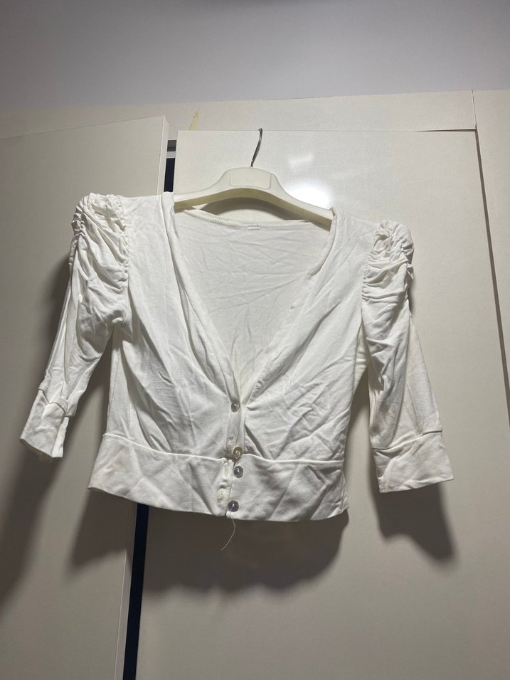 Düğmeli, beyaz merserize kumaştan kısa ve fitted kesim kadının hırka Uzun kollu, V yakalı, hafif buruşuk omuz detaylı, günlük sokak stili için uygun.