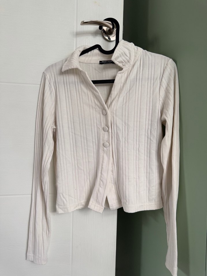 Düğmeli beyaz üst uzun kollu, yakalı ve fitted kesim. Minimalist ve streetwear tarzıyla günlük kullanıma uygundur. ✨