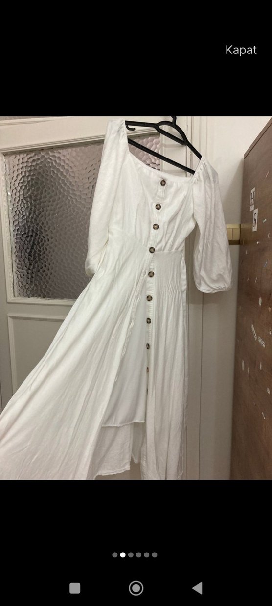 Yumuşak keten kumaştan yapılmış, düğmeli ön kısmı ve kayık yaka ile askılı kollara sahip, bol kesim beyaz bohem elbisedir. Günlük kullanıma uygundur.