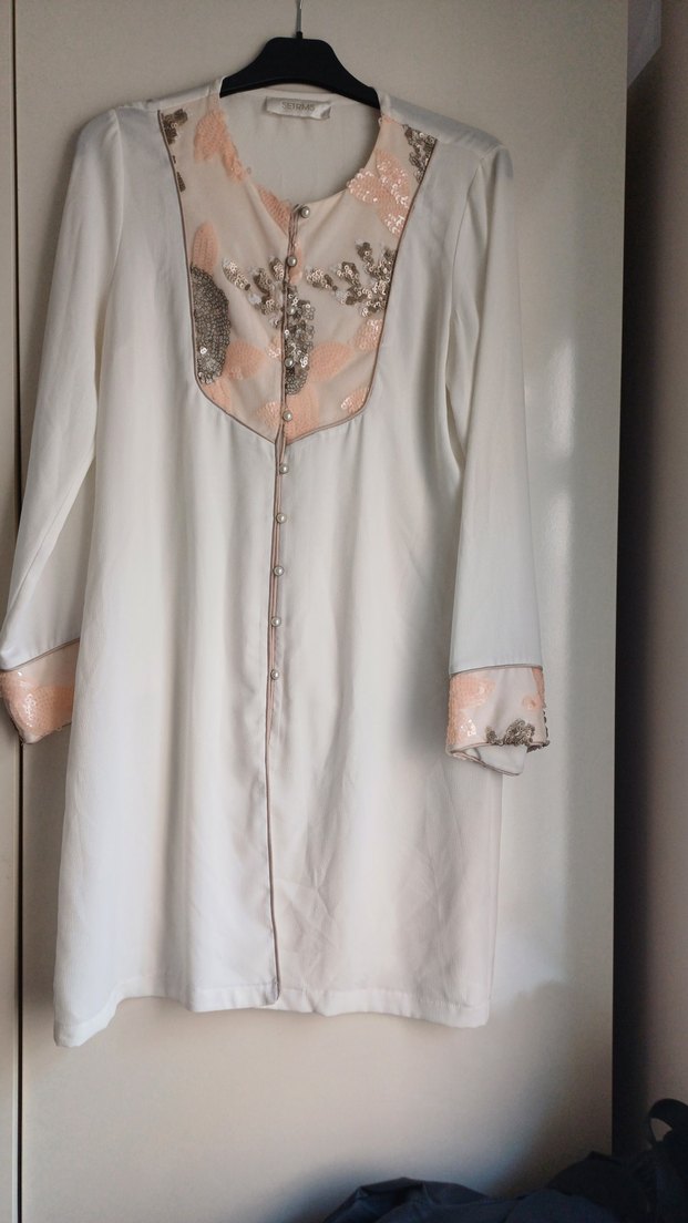 Düğmeli, V yaka, uzun kollu beyaz bohem tunik. İpek gibi kumaş ve pastel nakış detaylarıyla düğünler için uygun.