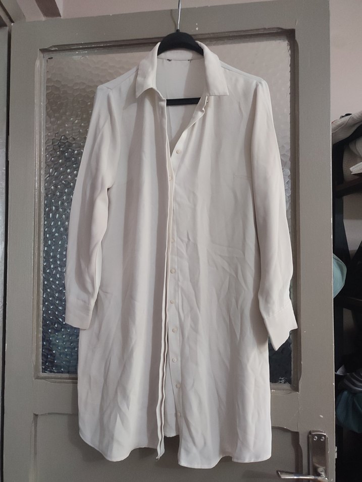 Uzun, bol kesim beyaz gömlek, düğmeli ve kesik yaka detaylıdır. Minimalist tasarımlı, günlük rahat sokak stiline uygundur.