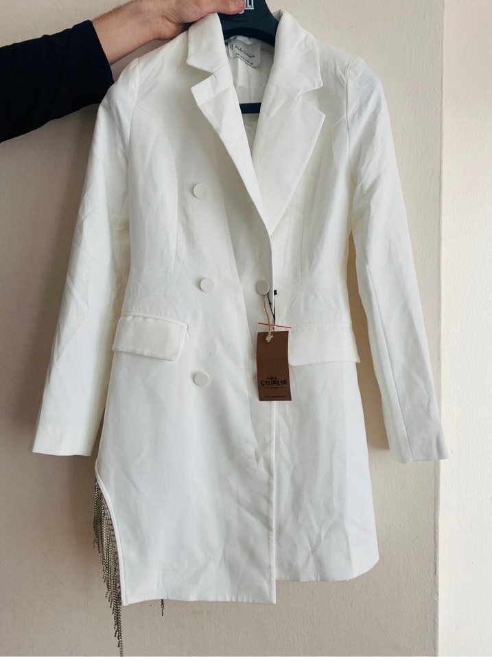 Düğmeli ve kesik yakalı beyaz uzun kadın blazer ceketi, uzun kollu ve regular fit. Sentetik kumaştan, iş ve günlük kullanım için uygun. Moda çelikler marka. Yeni etiketli. Aldıgımdan beridir hiç kullanmadım. Tertemiz ve çok şık. Boyu 87 cm eni 42