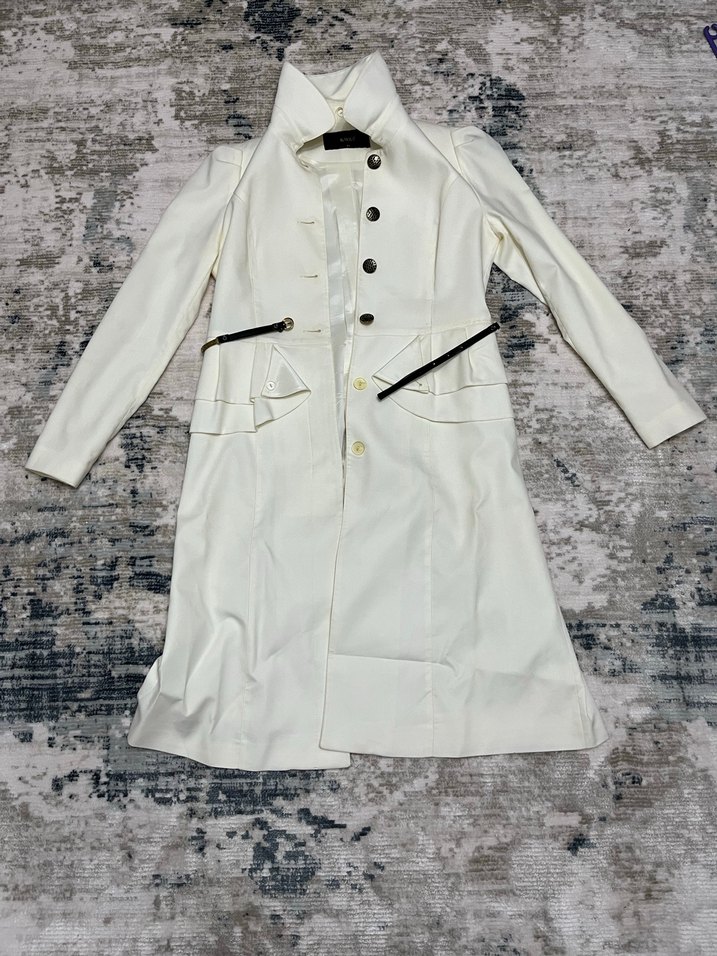 Düğmeli ve uzun kollu, beyaz renkli kadın ceket.Bebe yaka ve düz tasarıma sahip, sentetik kumaştan yapılmıştır. Ofis ve özel günler için uygun, düzenli kesim ve belinde siyah kemere sahip.Hafif sararmalar mevcut.Dolapta durduğu için.Ama kumaşı çok iyi durumda.Az kullanılmış.Temizleme giderilebilir bir durumda.