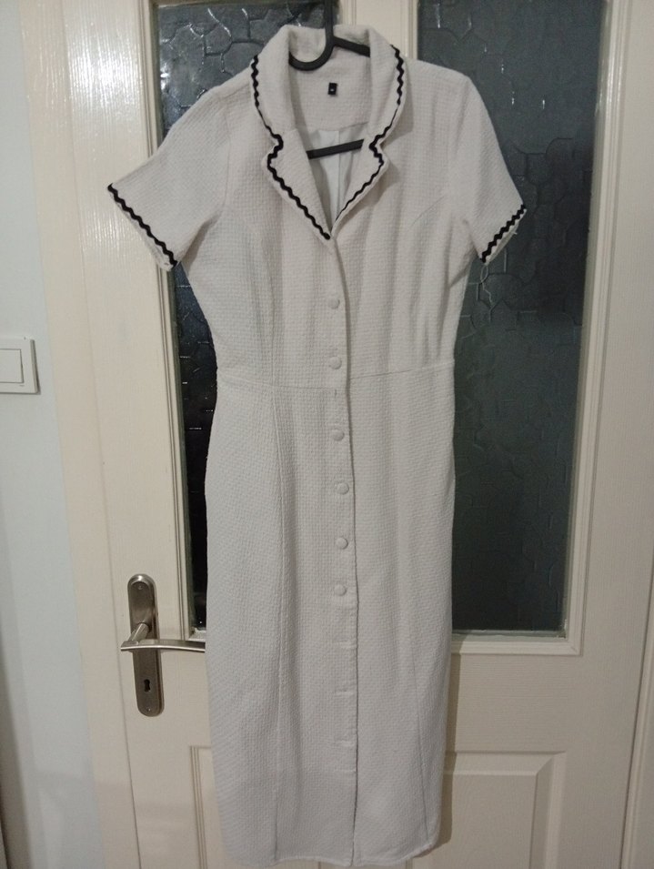 Kısa kollu ve siyah detaylı yakasıyla düğmeli uzun beyaz elbise. Ofis kullanımı için uygun, regular kesim ve düğme kapamalı.