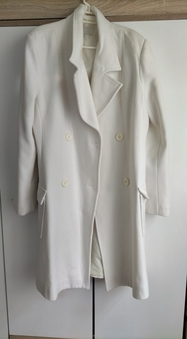 Düğmeli beyaz uzun kaban, yumuşak ve sıcak kumaştan üretilmiş, klasik şıklık ve ofis kullanımı için uygun.