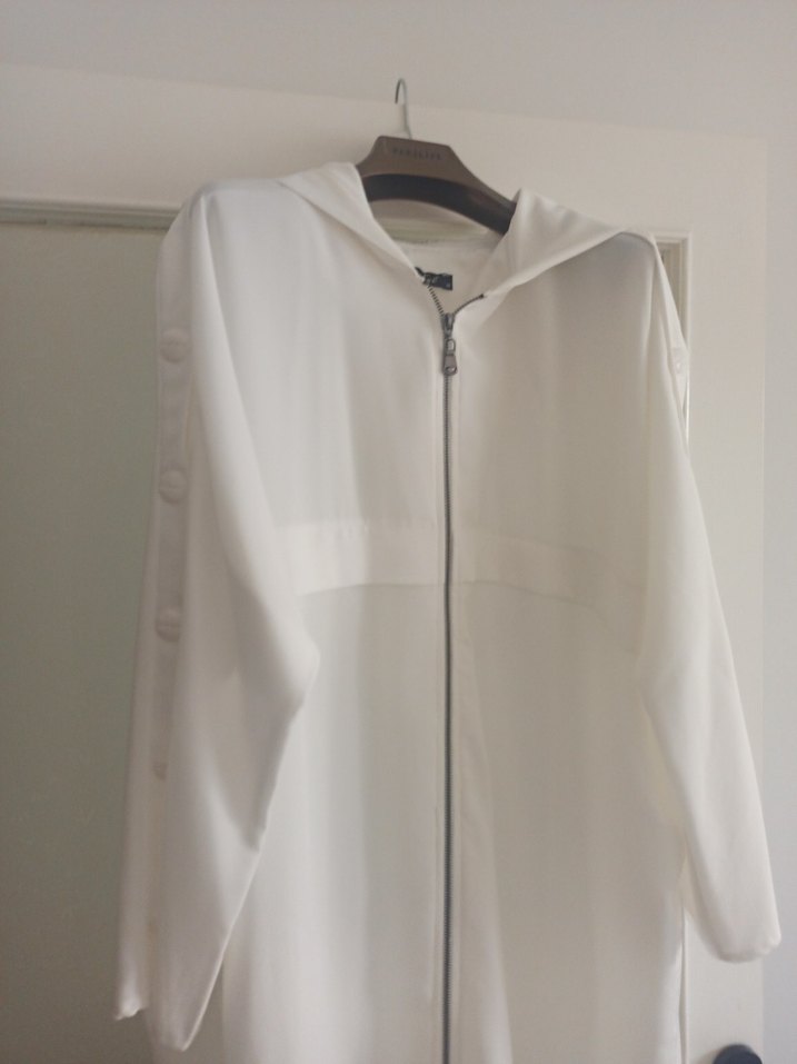 Düğmeli, yüksek yakalı ve uzun kollu beyaz uzun kap. Pürüzsüz sentetik kumaştan, minimal ve sokak stili için uygun, günlük kullanıma uygun.