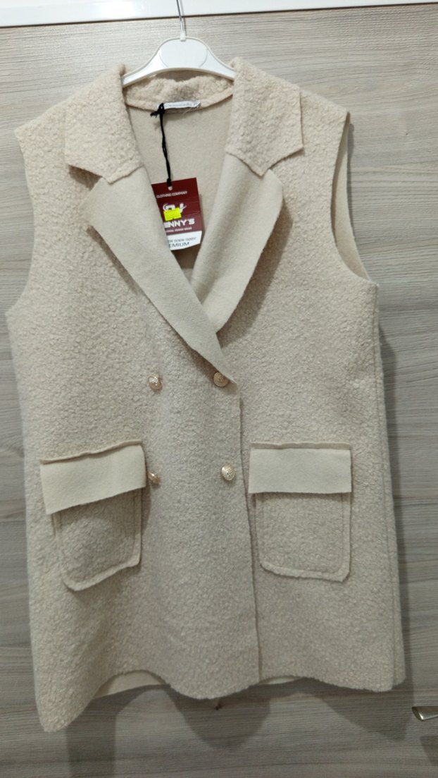 Yumuşak ve sıcak kumaştan üretilmiş, düğmeli ve yakalı beyaz uzun kadın yelek. İki cep ve rahat kesimi ile gündelik kullanıma uygundur. Sıfır ve etiketli. 1350 ye alındı