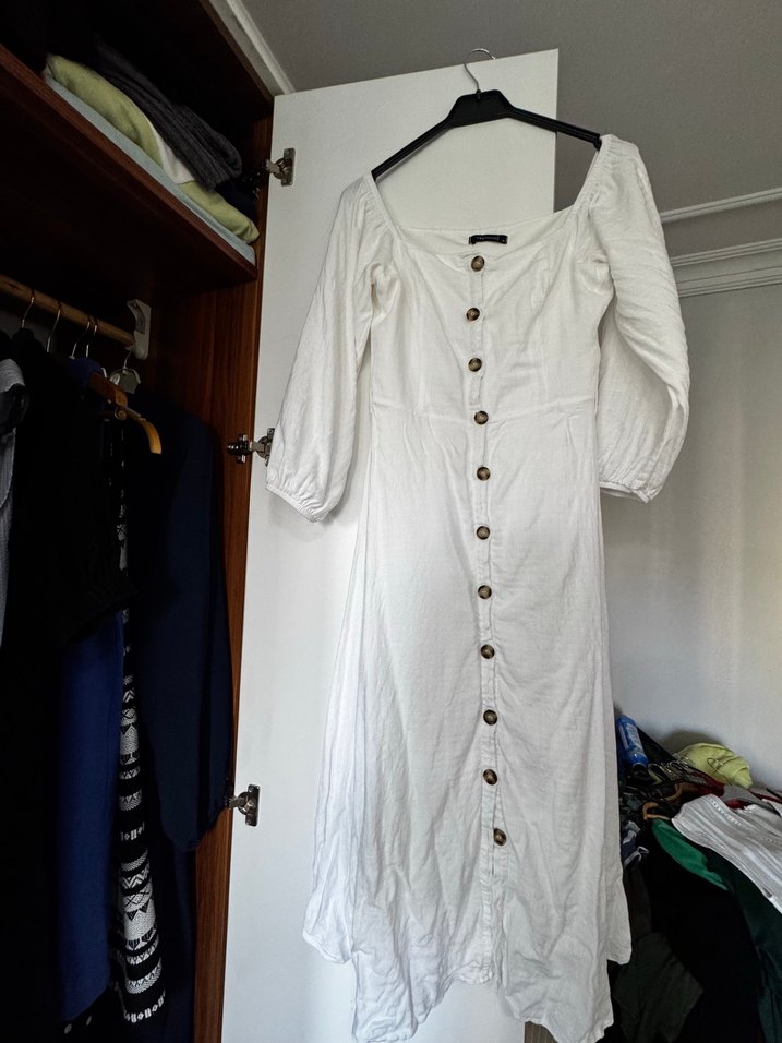 Düğmeli, beyaz keten kumaştan, uzun kollu ve kayık yaka, bol kesim bohem tarz elbise. Omuzları ister düşük ister normal kullanım çok güzel bir elbise 38 beden üç kere giydim tertemiz