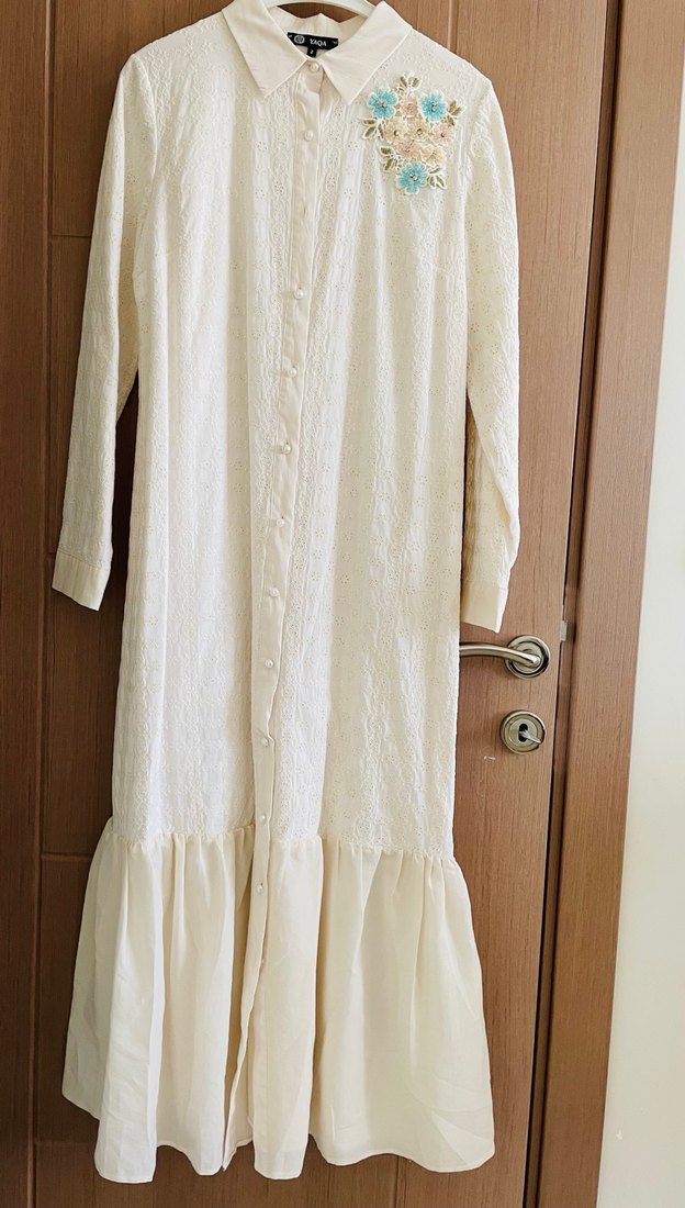 Düğmeli, nakışlı detaylara sahip beyaz uzun keten elbise. Uzun kollu, gevşek kesim ve vintage bohem tarzında, yaka kısmı çentikli. Düğün için uygundur. Temiz ve kusursuz durumda.Bir iki defa giyildi.