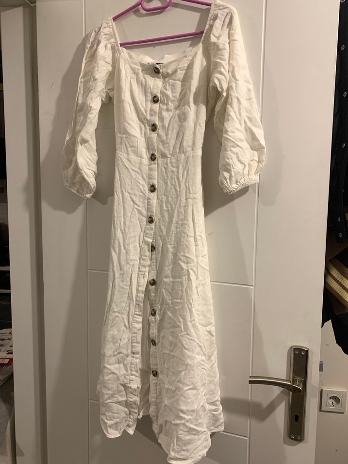 Düğmeli, uzun beyaz keten elbise, tekne yakalı ve uzun kolludur. Bol kesim, minimalist bohem tarzındadır.