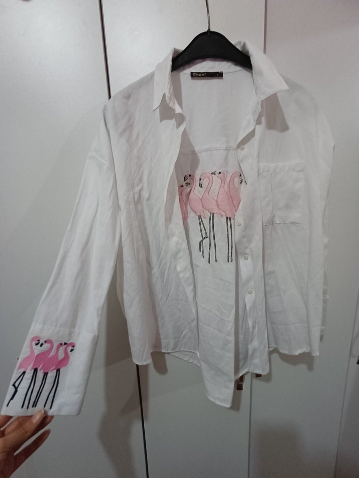 Pamuklu, beyaz, düğmeli, uzun kollu ve bol kesim kadın gömlek. Sırt ve manşetlerde pembe flamingo baskıları bulunur, sokak stili için uygundur .