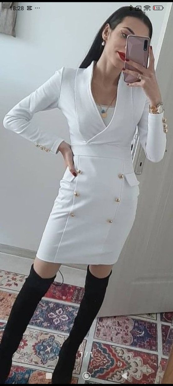 Düğmeli ve yakalı beyaz uzun kollu ceket elbise