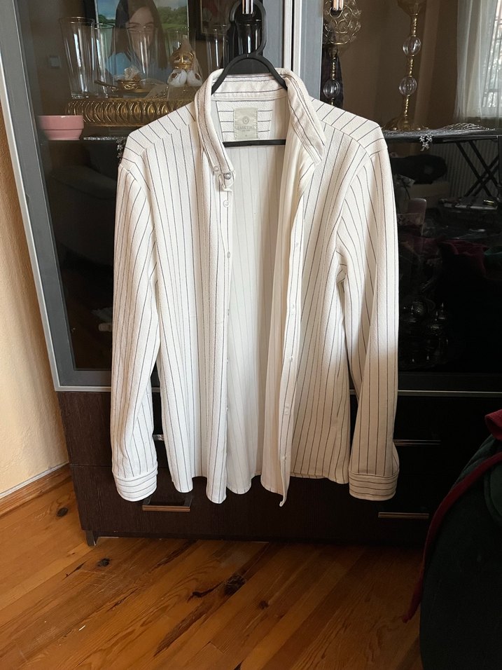 Beyaz, uzun kollu, düğmeli ve keten kumaştan yapılmış. Normal kesim ve midi boyda, ofis ve günlük kullanıma uygun bir gömlek.