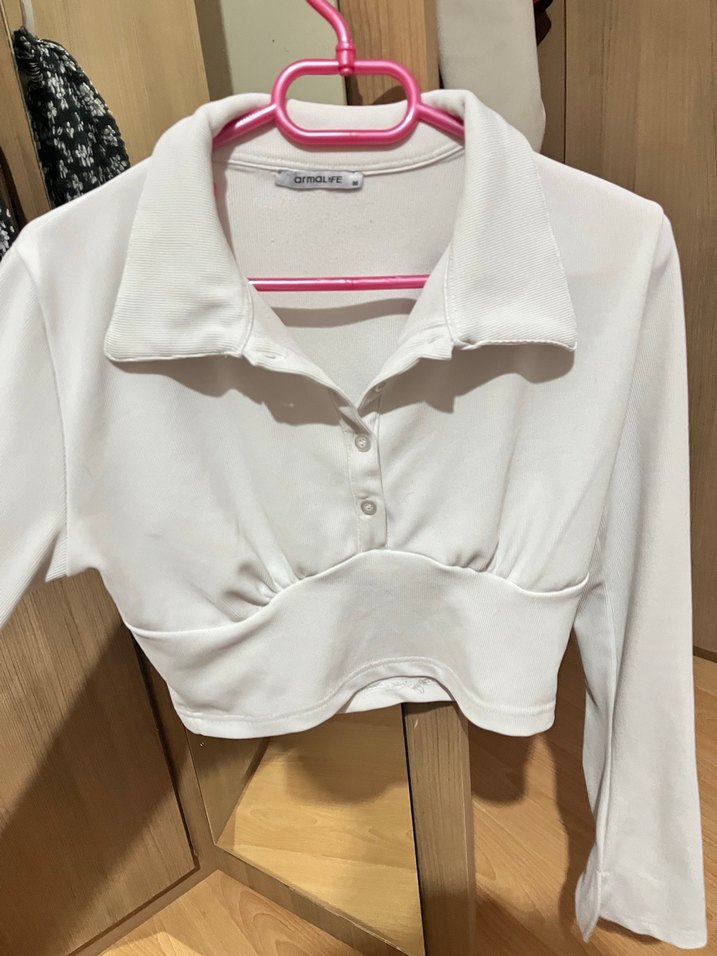 Beyaz, uzun kollu, yakalı ve düğmeli ön tasarıma sahip bluz Sentetik kumaştan, midi boyda ve vücuda oturan kesimde, günlük rahat kullanıma uygun.