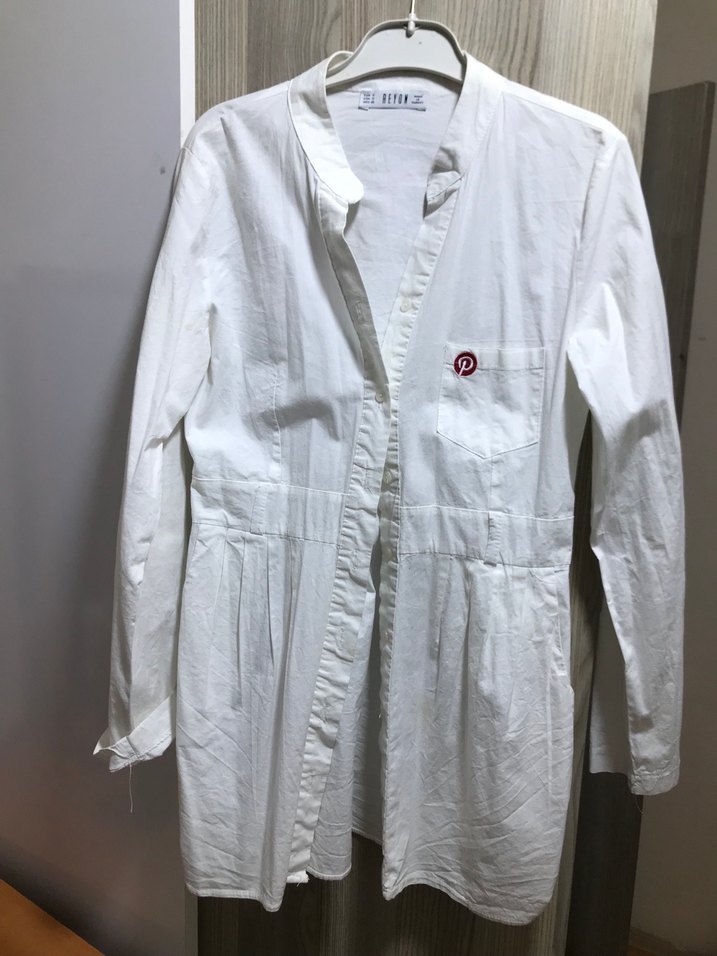 Beyaz düğmeli, uzun kollu ve yakası kesik detaylı gömlek. Salaş kesimi ve midi boyu ile rahat bir günlük kullanım sunar.