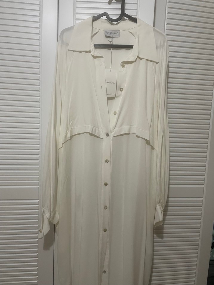 Düğmeli, V yaka, bol kesim beyaz uzun kollu elbise, yumuşak kumaştan üretilmiş. Bohem Paris tarzı ofis için uygun.
