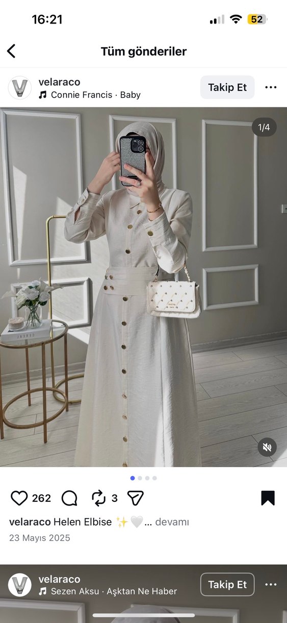 Krem rengi, uzun tesettür elbise. Düğme detayları ve şık tasarımı ile dikkat çekiyor. Özel günlerde veya günlük kullanımda tercih edilebilir. 1 bedendir 38 beden kemerlidir 165 boy 55 kg da giyildi Bayramda kullandım defosuz çok şık elbise