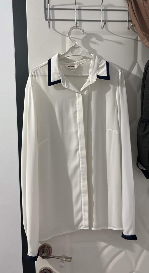 Düğmeli önü ve yakasında ince koyu şerit bulunan beyaz uzun kollu gömlek. Normal kesim ve midi uzunluk, ofis kullanımı için uygun.