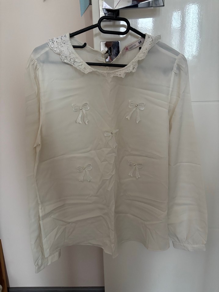 Dantel yakalı, düğmeli beyaz uzun kollu kadın gömleği. Normal kesim ve küçük fiyonk detaylarıyla rahat kullanım sağlar.