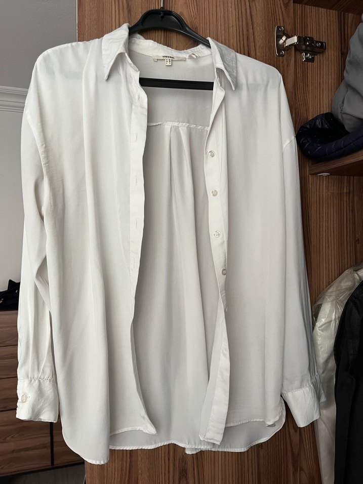 Düğmeli, yakalı beyaz kadın gömleği. Uzun kollu, bol kesim ve ipeksi kumaştan, minimalist ve şık ofis stili için uygun.