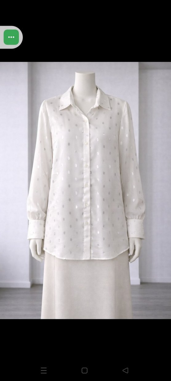 Düğmeli, uzun kollu ve yakalı beyaz kadın gömleği. İnce puantiye desenli, ipeksi kumaştan, rahat kesimli, ofis için uygun minimalist ve çağdaş stil. sadece bir kez giyildi